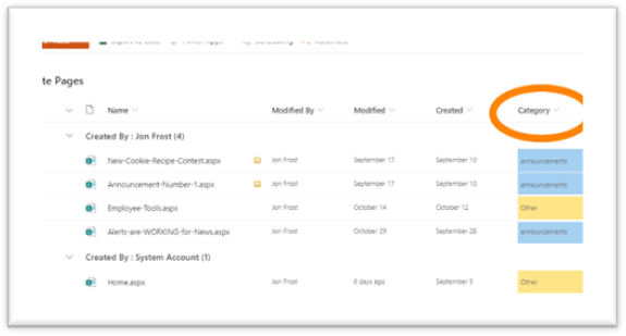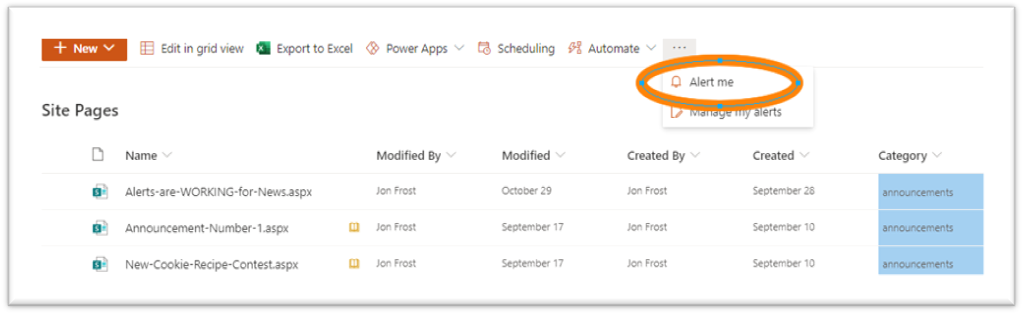 More perplexing is the situation behind achieving alerts for “news” items. As you probably know, news items are dependent on a process that creates a new page in the “site pages” library for each news item. The process for achieving alerts when new news items are posted is only slightly more complex. First you need to visit the site pages library and add a metadata column that allows you to identify which pages in the library are news items and which ones are not (for instance, the homepage). Once you start tagging all your news items as having a category of “announcements”, it’s a simple matter to create a view that lists only the pages that are announcement items. Capturing a link to that filtered view of the site pages library and providing it on the homepage gives visitors the ability to follow the link and to subscribe to an alert for the view dedicated to “announcement” items. One side note here, when we first added a metadata column of “category” to the site pages library it took over 24 hours for the view to become available in the “alerts” drop-down choice for available “views”.