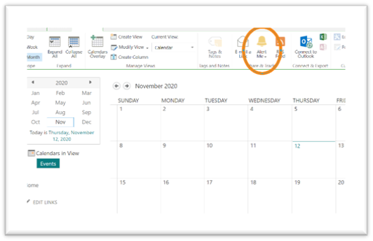 The events “function” is interesting in that, although creating an event and clicking on the link to see all of the events never shows a calendar view, the mechanism actually does depend on a traditional calendar in classic view, behind-the-scenes, in order to store the information. Visiting “site contents” easily reveals the classic calendar that is holding the events. Once you’re looking at the classic calendar it’s easy to capture a link to it and provide it as a “resource link” on the homepage along with an instruction for signing up to be alerted when there are new events. When someone follows the link they’re delivered to the classical full calendar view of the events list, which of course has a ribbon that contains the alert icon. It may not be elegant, but it makes it possible for people to sign up to what will probably be the most dynamic events list in the intranet.